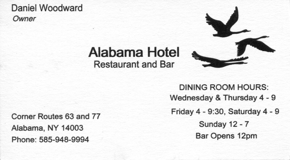 Basom, New York /. Alabama Hotel, 1353 Lewiston Rd /. Alabama Hotel menu.