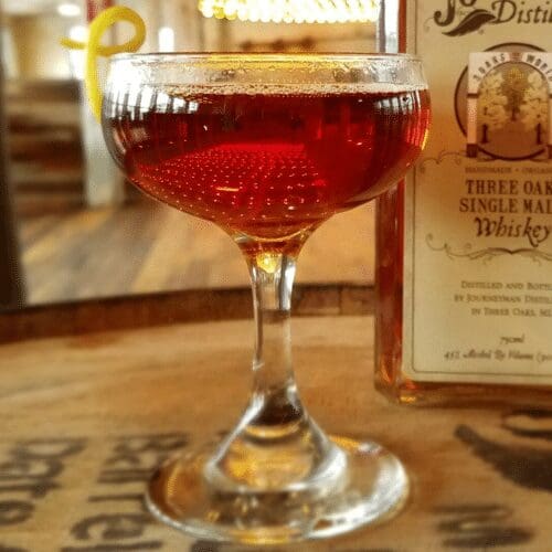 2 oz. Journeyman Three Oaks Single Malt Whiskey 1 oz. Sweet Vermouth 1-3 Dashes Angostura bitters
