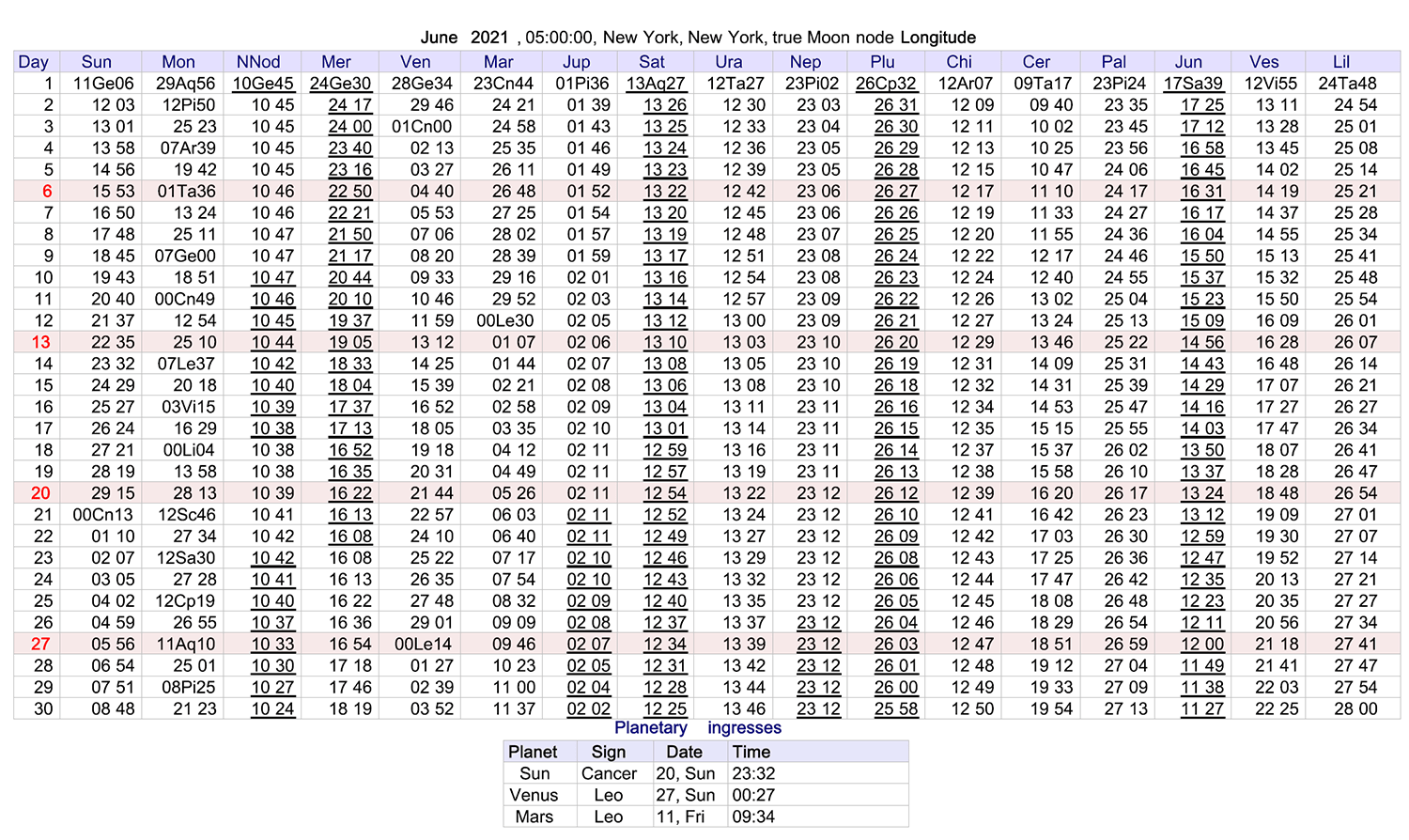 The following day, January 3rd, at midnight, the Moon is at 2 Libra 05. Underlines are retrograde planets, and pink lines are Sundays. See also: If you prefer the classic ephemeris with glyphs …