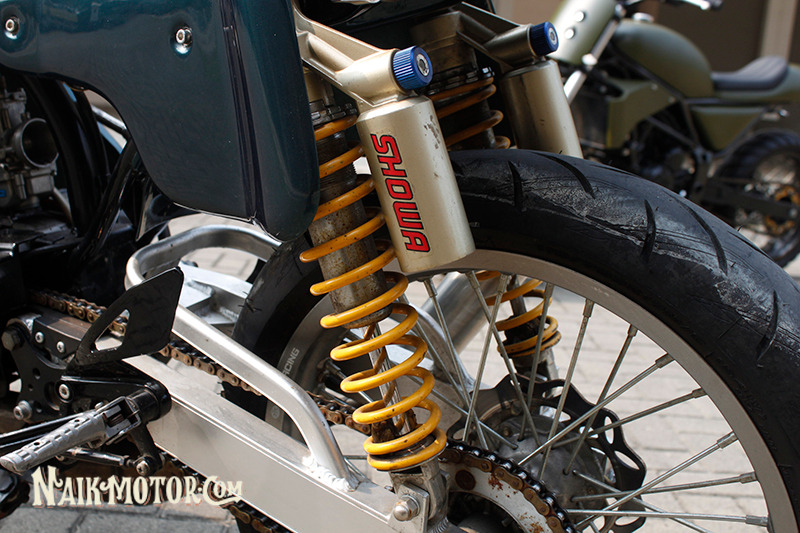 Impresi pertama pada RX135 cafe racer ini adalah elegan dengan warna biru tua ditangkinya. Ditambah lagi dengan suspensi belakangnya yang unik.