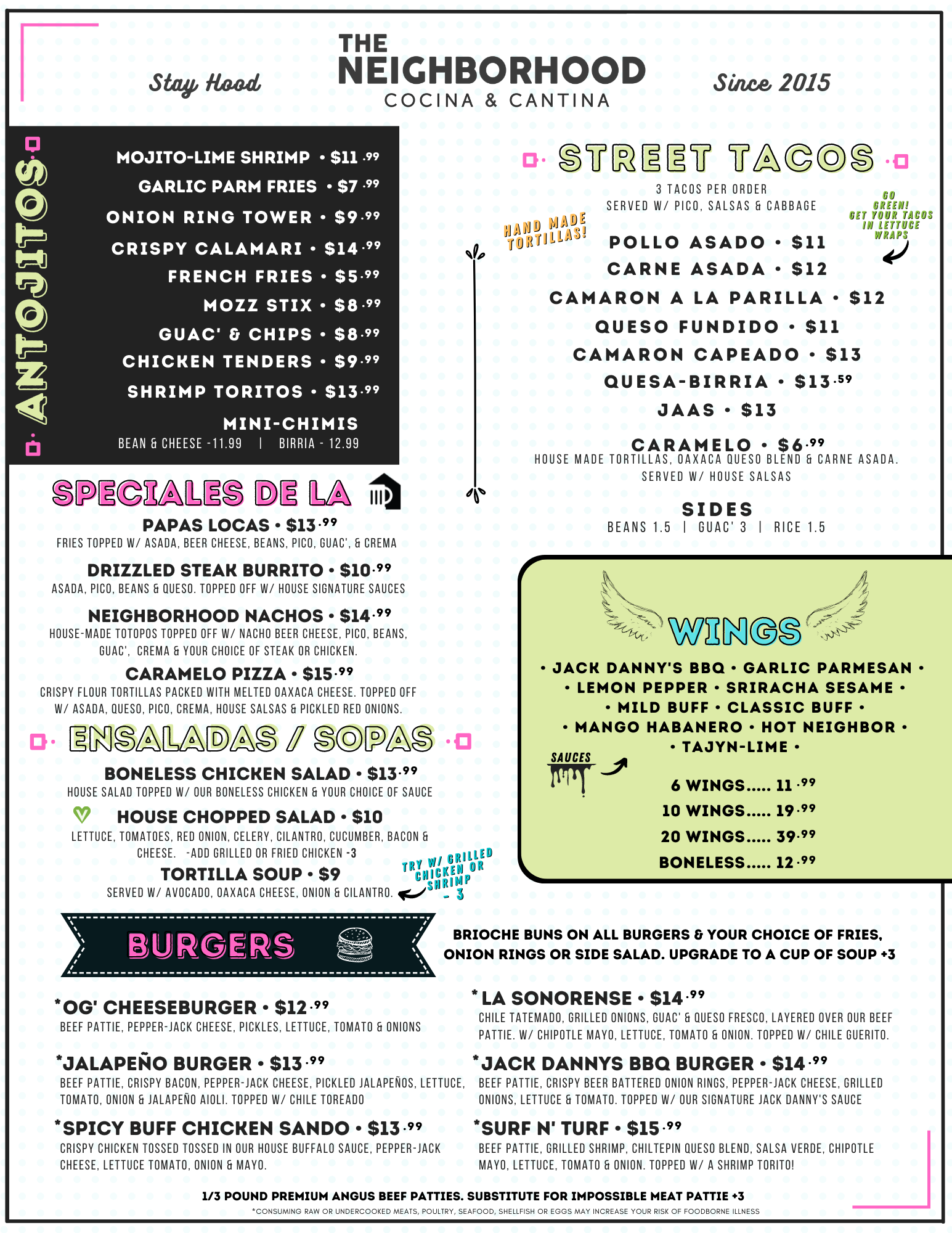 Online menu for The Neighborhood in Tucson, AZ - Order now! THE NEIGHBORHOOD COCINA & CANTINA - Known for good eats, specialty cocktails & Tucson's best Michelada since 2015!